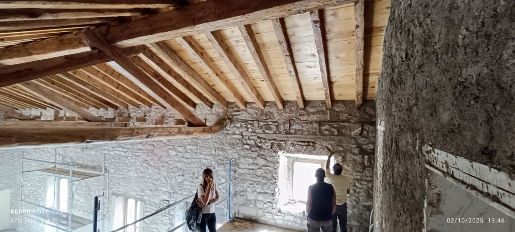 En esta fase se han realizado las actuaciones en el edificio de la lonja de colocación de estructura del despacho del alcalde; picado del revestimiento de los muros perimetrales de mampostería; sustitución de carpinterías; cosido de fábrica exterior y sustitución de vierteaguas y dinteles; sustitución de elementos dañados y tratamiento curativo del forjado de la lonja así como colocación de aislamiento en el pavimento.