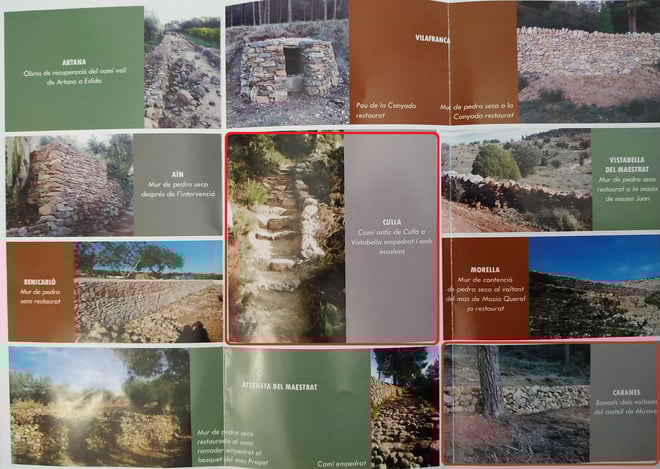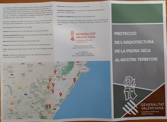 Recientemente el Servei Territorial de Cultura i Esport de Castelló de la Generalitat Valenciana ha confeccionado un díptico con las últimas actuaciones realizadas para la protección de la arquitectura de piedra en seco en nuestro territorio. Assitencia Técnica Global Enginyers SLP participó en la catalogación del "Antic Camí Culla-Vistabella" y el entorno del "Castell de Miravet" y en la posterior Dirección de las Obras de recuperación, mantenimiento y conservación.